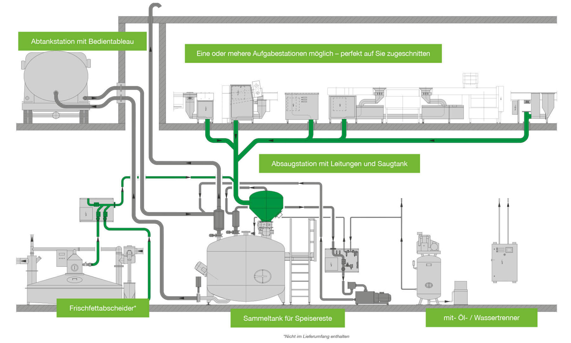 Über eine Absaugleitung findet über Bedientableuas von außen die automatische Entleerung der Sammeltanks mittels Abtankfahrzeugen statt.