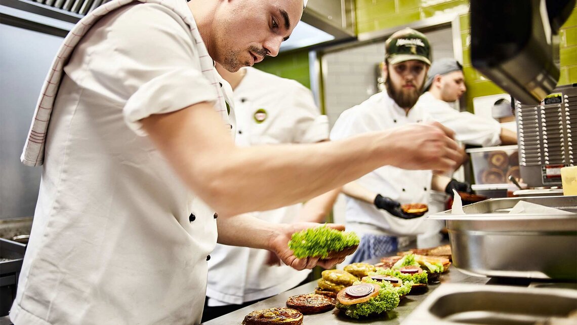 At Burgerlich, we make everything ourselves using fresh, local ingredients. We make very popular food that way, so we can easily serve 200 meals in 150 minutes across a lunchtime. That is one meal every 45 seconds. Workflows in the kitchen have to be perfect – from placing the order to interacting with the warewashing technology to disposing of food waste