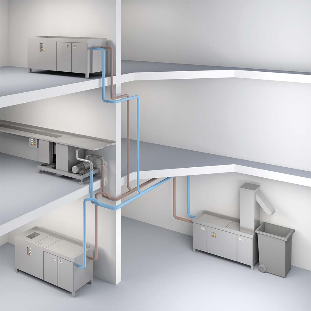 MEIKO has always believed in thinking outside the box. Even back in the 1970s and 1980s, we knew that kitchen waste was a valuable resource that could help boost sustainability. Alongside our warewashing and disinfection solutions, our engineers also develop superior technology for shredding, compressing and collecting food waste and production waste. Our efficient and hygienic systems can handle a wide array of waste, including bones and crustacean and mollusc shells.